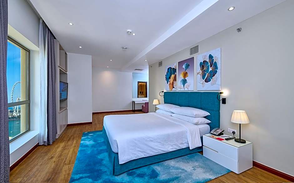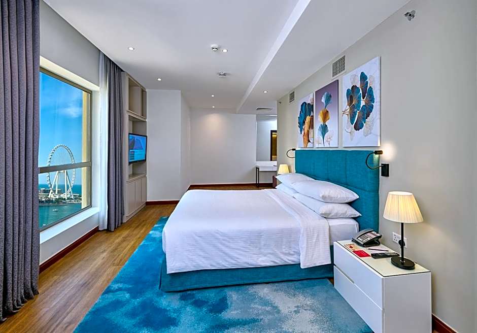 Overlooking the Arabian Gulf, this suite consists a separate kitchenette for family with additional separate dinning area. It features free WiFi, separate living room and a bedroom with king size bed. The bathroom is fitted with a shower, slippers and free toiletries. Please note that 2 children below the age of 8 can stay free of charge if using existing beds.